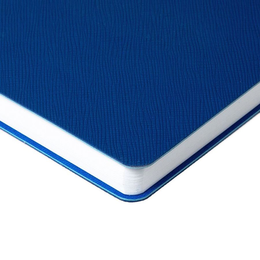 Ежедневник с гибкой обложкой выполнена из материала Nice Touch, синий и Latte, синий (внутренняя часть обложки), дополнен горизонтальной резинкой в цвет обложки. Внутри корешка — специальное место для крепления ручки размером до 15х1 см.