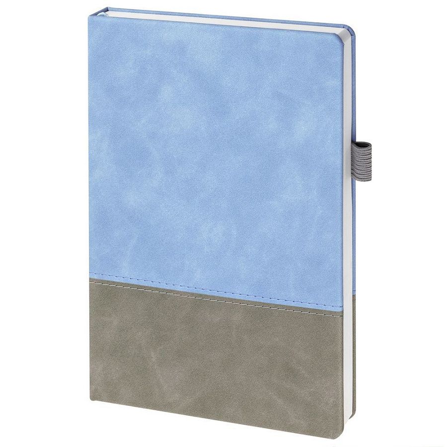 Ежедневник с твердой обложкой, без поролона, со сшивкой материалов Nubuck Touch, серый СС, и Nubuck Touch голубой JJ, дополнен двойным ляссе и петлей-резинкой для ручки.