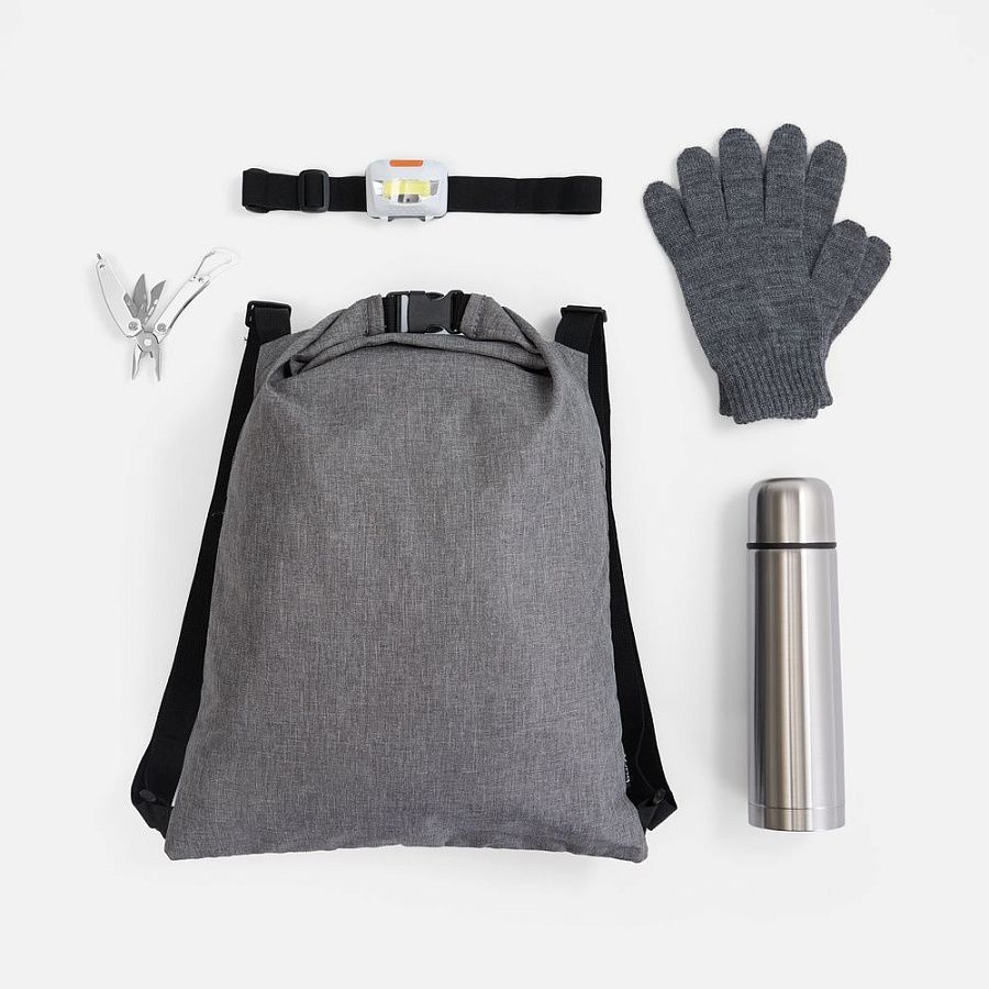 перчатки - шерсть 50%; акрил 50%; мультитул - алюминий, нержавеющая сталь; фонарь - пластик; рюкзак - полиэстер, 300d; термос - нержавеющая сталь, 304 внутри, 201 снаружи; пластик