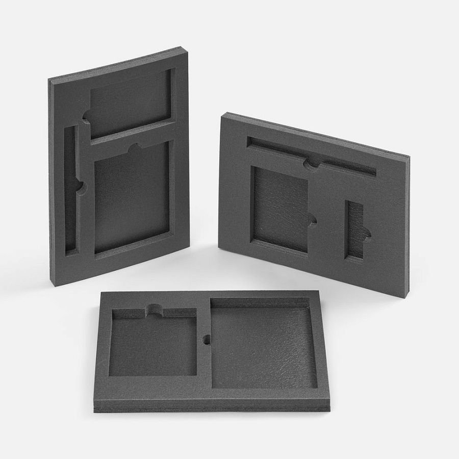 Ложемент, изготовленный из материала Izolon 500 черного цвета, представляет собой многослойную конструкцию, состоящую из нижнего слоя толщиной 5 мм и верхнего слоя толщиной 10 мм. В соответствии с утвержденным макетом, проемы для размещения предметов могут быть спроектированы как в одном, так и в обоих слоях.