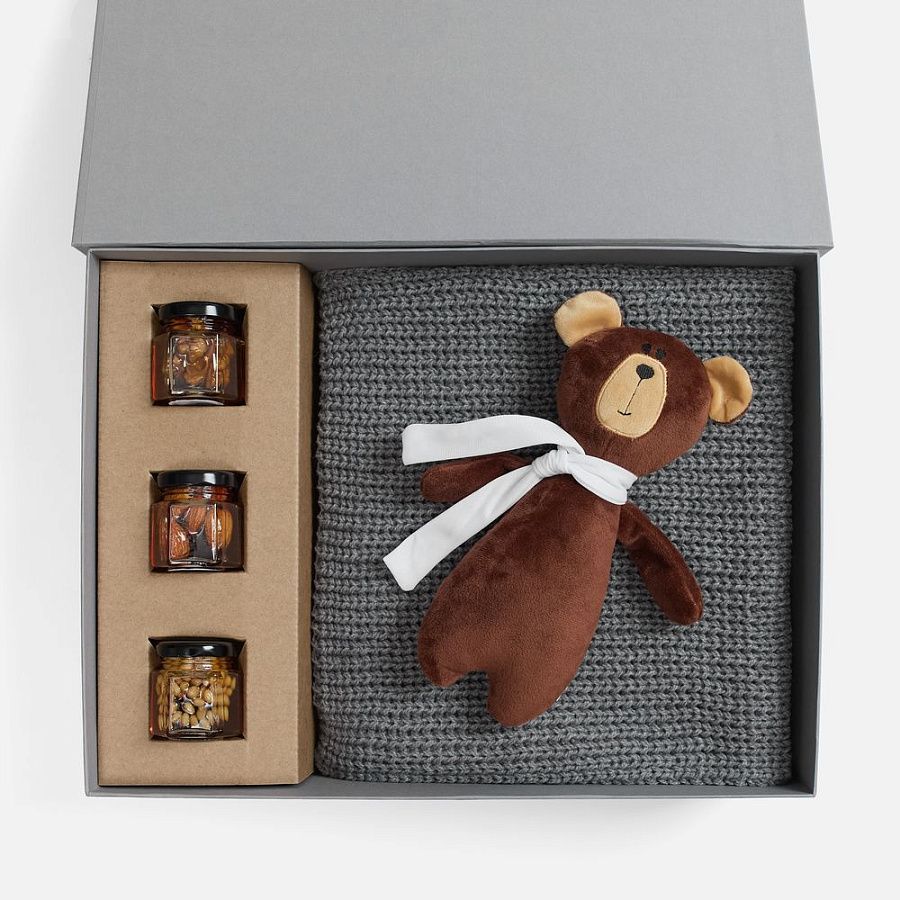 Милый мишка в шарфике с целой коллекцией разнообразного ароматного меда идеально дополняет основной, более практичный подарок — объемный шарф из толстой пряжи, который впишется в любой зимний образ.