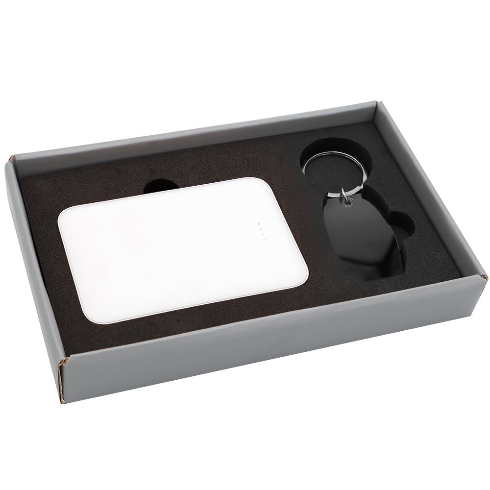 Подарочный набор в элегантной цветной картонной коробке серого цвета с конструкцией крышка-дно. Внутри расположены аккуратно закрепленные на ложементе внешний аккумулятор емкостью 5000 mAh и металлический карманный брелок. Внешний аккумулятор обладает компактным дизайном и обеспечивает надежный запас энергии для мобильных устройств в пути, а стильный металлический брелок станет практичным и эстетичным аксессуаром для ключей. Этот набор идеально подходит в качестве презента для тех, кто ценит удобство, качество и современный стиль.
