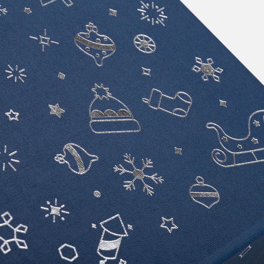 Коробка выполнена из переплетного картона толщиной 1,5 мм, кашированного бумагой с тиснением серебристой фольгой.