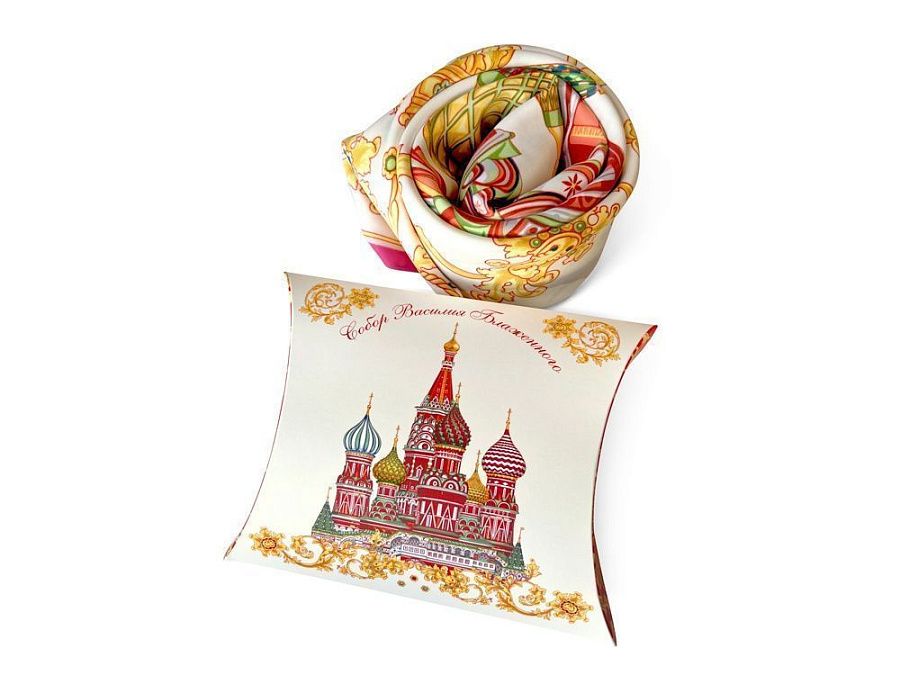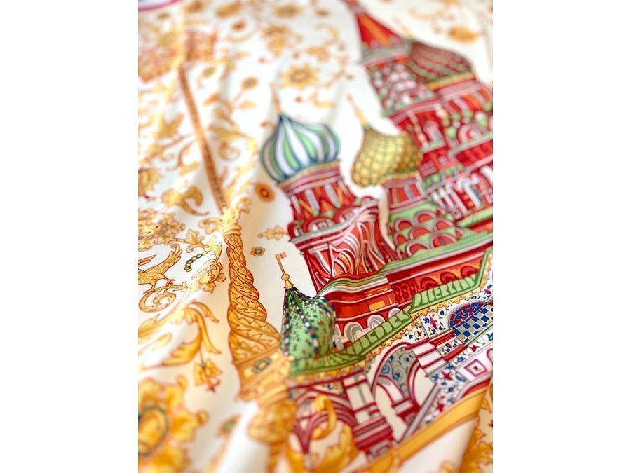 Сказочный вид собора отражен на золотом фоне новинки от бренда «Русские в моде» by Nina Ruchkina. Настоящее восьмое “чудо Света” обрамлено царскими коронами и райскими птицами, свидетельствующими об уникальности и роскоши этой исторической достопримечательности, отстроенной 1 октября 1552 года на праздник Покрова Богородицы.