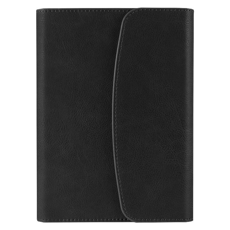 3. Ежедневник в суперобложке A5+,недатированный, в твердой обложке. Закрывается на магнитную застежку.Ежедневник-портфолио имеет карман под визитки или бумаги, петельку для ручки. Количество листов - 128. Цвет - чёрный.