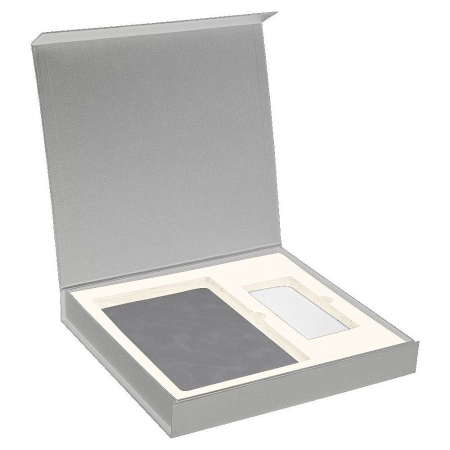2. Подарочная коробка, размер 29,7*28,0*4,5 см, с магнитным клапаном под индивидуальную вырубку, серебристая, с бежевым ложементом,