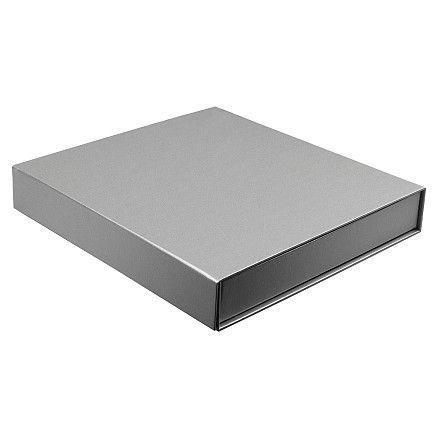 Подарочная коробка, размер 29,7*28,0*4,5 см, Solution Prestige Magnum Linen с магнитным клапаном под индивидуальную вырубку, серебристая, с бежевым ложементом.