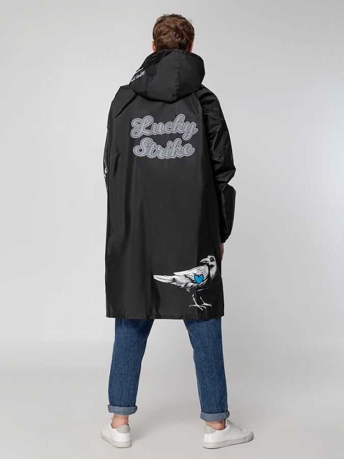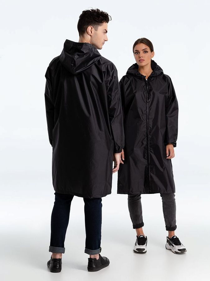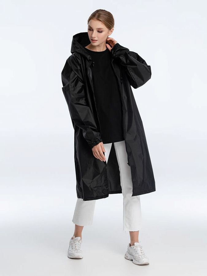 Плащ-дождевик из ткани таффета на молнии с капюшоном. Складывается в мешочек — удобно брать с собой.