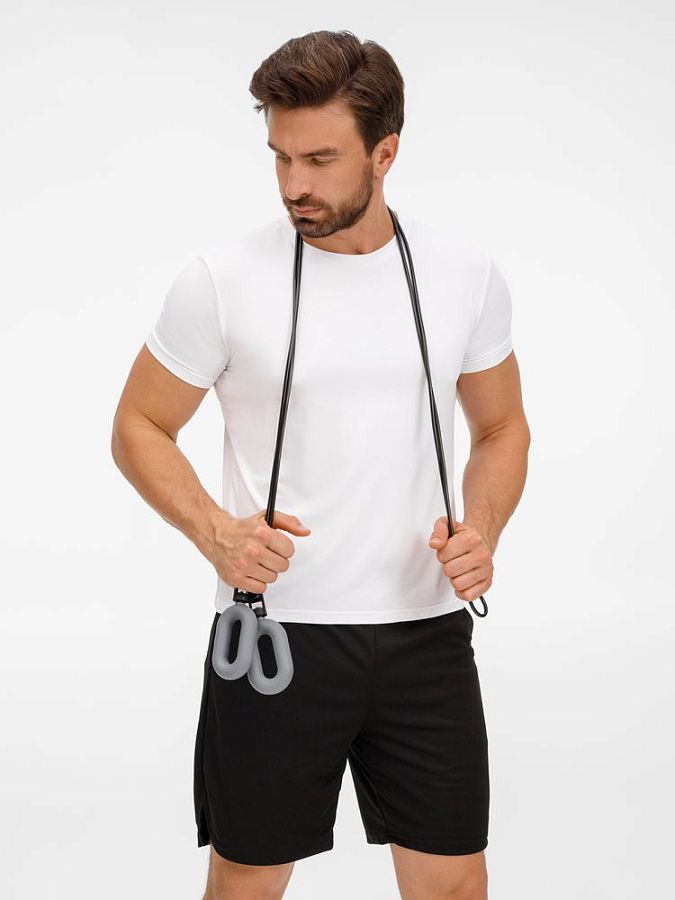 Шнур к ручкам-эспандерам крепится через пластиковый переходник с отверстиями для продевания шнура. Эспандеры выполнены из тактильно приятного силикона, обладающего высокой степенью эластичности и прочности, а широкий шнур (5 мм) — из плотного ПВХ.