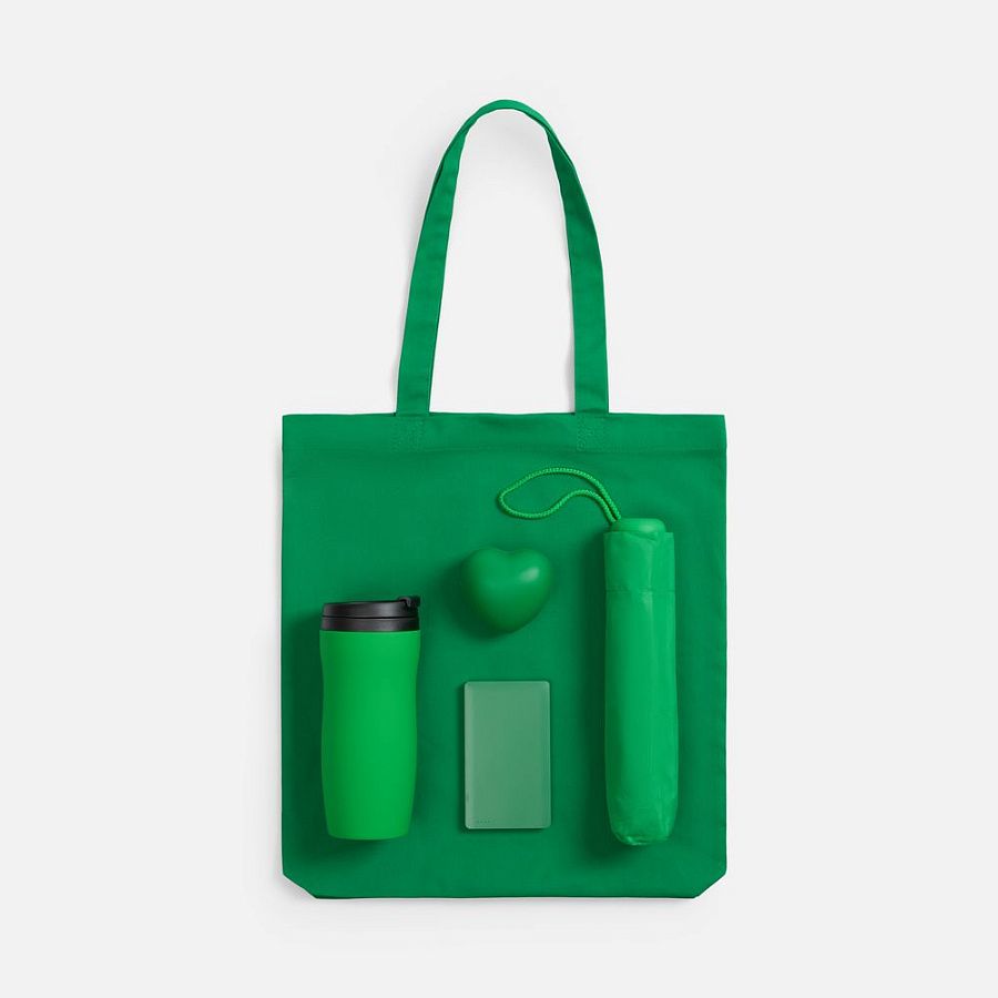 зонт - полиэстер 190t, ручка - пластик; покрытие софт-тач; каркас, спицы - металл; аккумулятор - пластик; крышка термостакана, внутренняя колба - пластик, корпус - нержавеющая сталь; покрытие софт-тач; сумка - хлопок 100%, плотность 210 г/м²; антистресс - вспененный полиуретан