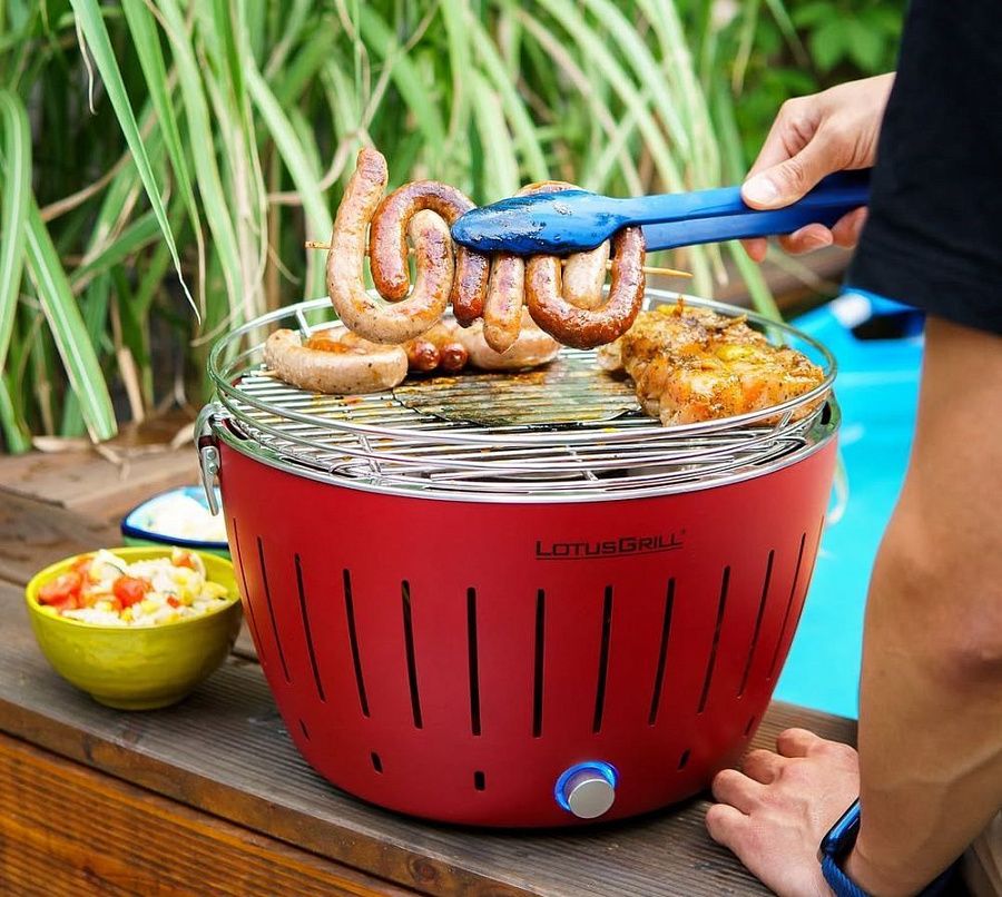 Угольный гриль округлой формы. Благодаря особой конструкции нижняя часть гриля не нагревается, его можно размещать даже на чувствительных поверхностях.