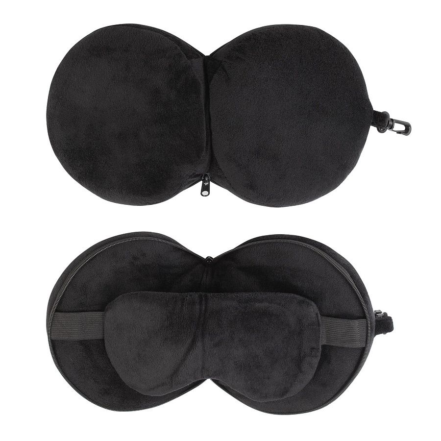 "2Go" - когда дорога в радость! Компактный аксессуар 2в1: маска и подушка для путешествий легко поместится в сумке или рюкзаке, можно использовать карабин для крепления снаружи. Практичный черный цвет.