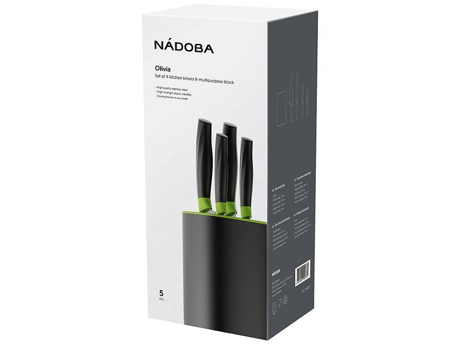 Набор ножей 5 предметов NADOBA серии Olivia состоит из: нож овощной, 9 см, нож универсальный, 12,5 см, нож разделочный, 20 см, нож поварской, 20 см и универсального блока для хранения ножей.