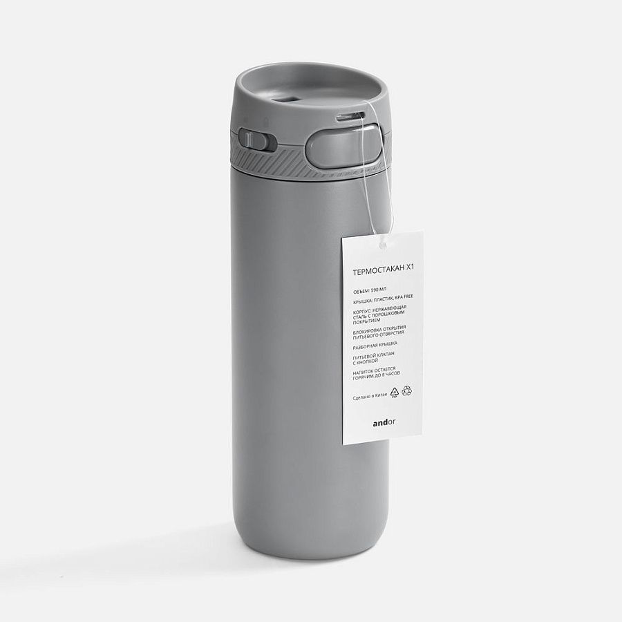 Специально спроектированная конструкция термостакана Andor со съемной кнопкой и отверстием для подвеса на крышке открывает простор для различных вариантов кастомизации и нанесения изображений. На изделии и упаковке нет айдентики бренда, а название бренда с картонного лейбла легко удалить.