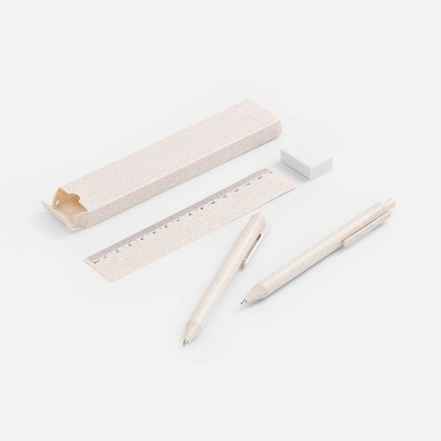 - В комплекте ручка, механический карандаш, линейка, ластик и упаковка.