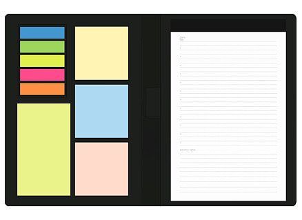Блокнот со стикерами выполнен из искусственной кожи в твердой обложке. Материал рельефный, приятный на ощупь, напоминает джинсу.