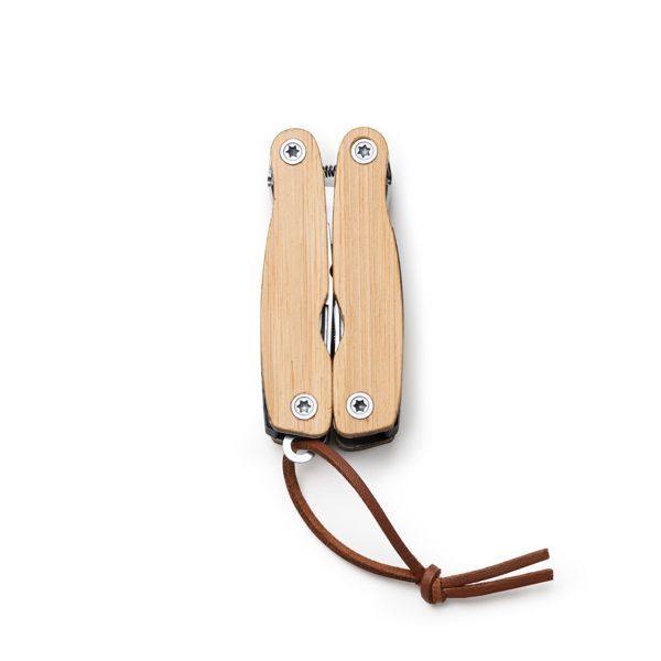 Универсальный инструмент с основной конструкцией и аксессуарами из нержавеющей стали, ручки из бамбука. 12 функций: нож, зубчатый нож, напильник, открывалки для бутылок, отвертки и плоскогубцы. Эко-коробка