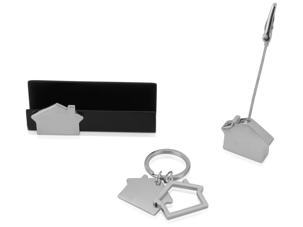 Создайте профессиональный и элегантный образ с нашим тематическим набором — отличным решением для организаций, занятых в строительной сфере, и не только. Этот изящный комплект включает визитницу, брелок и держатель для бумаг, выполненные из металла серебристого цвета в форме домика — символа надежности и профессионализма.