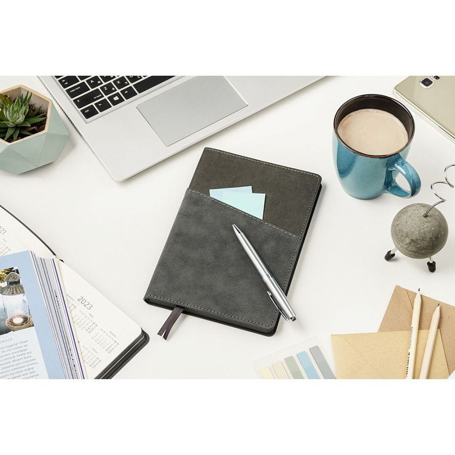 Ежедневник в гибкой обложке, с двумя карманами на лицевой и обратной стороне обложки. Карманы предназначены для хранения записок, визиток или ручки, также в карман можно положить мобильный телефон небольшого размера.