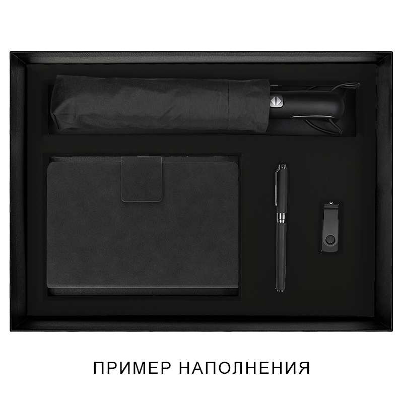 Подарочная коробка Solution Prestige с магнитным клапаном изготовлена из переплетного картона, снаружи кашированного дизайнерской бумагой фактурой имитирующей лен. Ложемент черного цвета с вырубкой. Материал: флокированная пена EVA.