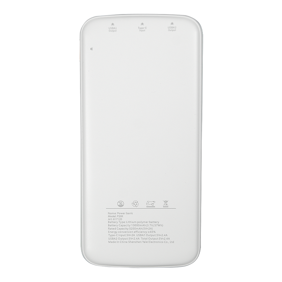 Портативное зарядное устройство нового поколения позволит зарядить ваш смартфон в любом месте. Устройство поддерживает стандарт зарядки 2.4А. На торцевой стороне разъемы: USB-A (x2), USB-C (предназначен для зарядки самого устройства). Светодиодный индикатор заряда поможет контролировать состояние заряда аккумулятора.