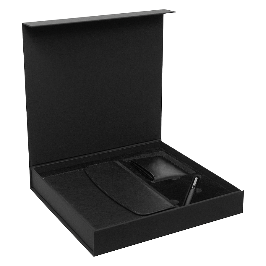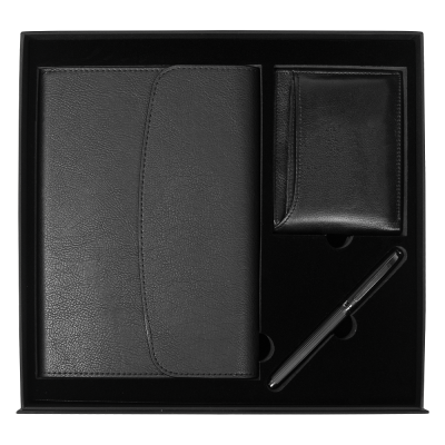 Погрузитесь в мир элегантности с набором Solution Prestige Trio. Этот роскошный комплект в стильном черном цвете сочетает в себе безупречное качество и утонченность. Внутри вас ждет ежедневник в суперобложке, элегантный кошелек и изысканная ручка — все, что нужно для успешного дня. Каждый элемент набора продуман до мелочей и изготовлен с вниманием к деталям, чтобы подчеркнуть ваш статус и стиль.