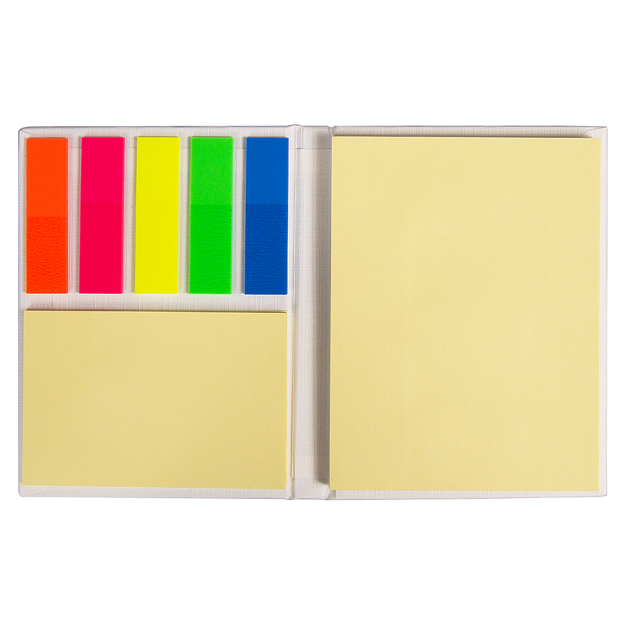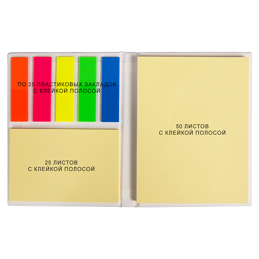 - Клейкие пластиковые закладки в 5 цветах по 25 штук (размер: 46 × 12 мм) помогут выделить важные моменты в записях.