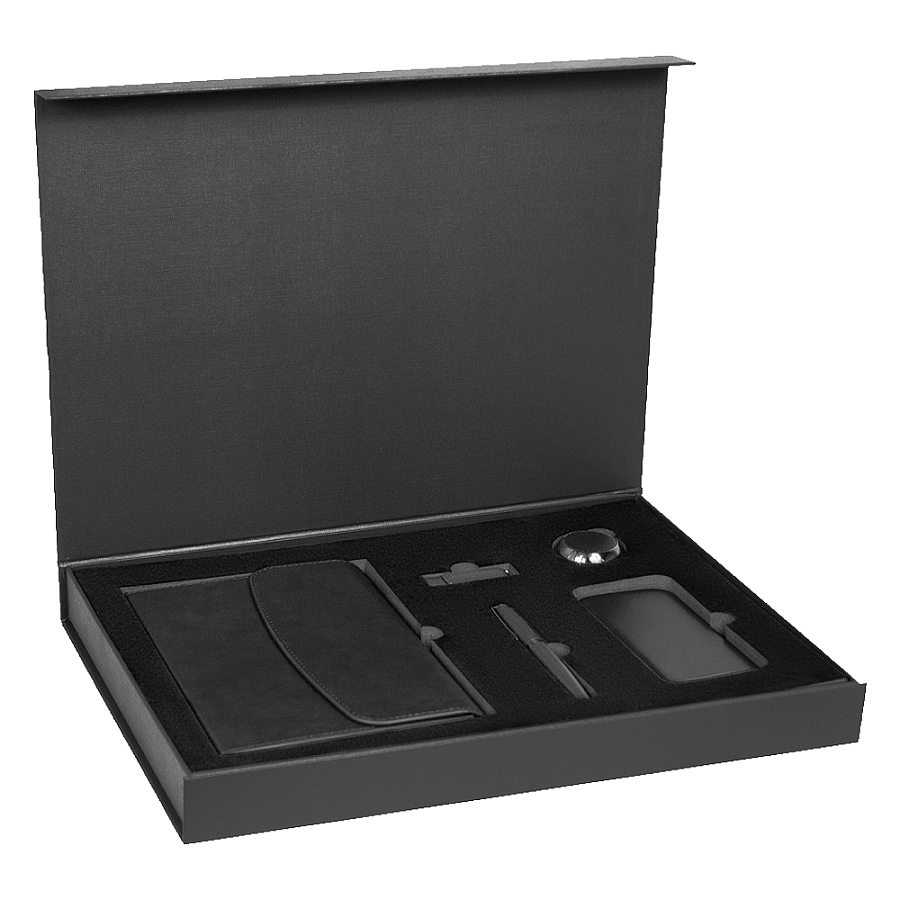 Элегантная упаковка с магнитным клапаном скрывает внутри изысканную композицию аксессуаров, идеально подходящих для деловой среды и повседневного использования. Два цветовых решения — глубокий черный и благородный синий — позволяют выбрать настроение подарка: от строгой классики до утончённой индивидуальности.