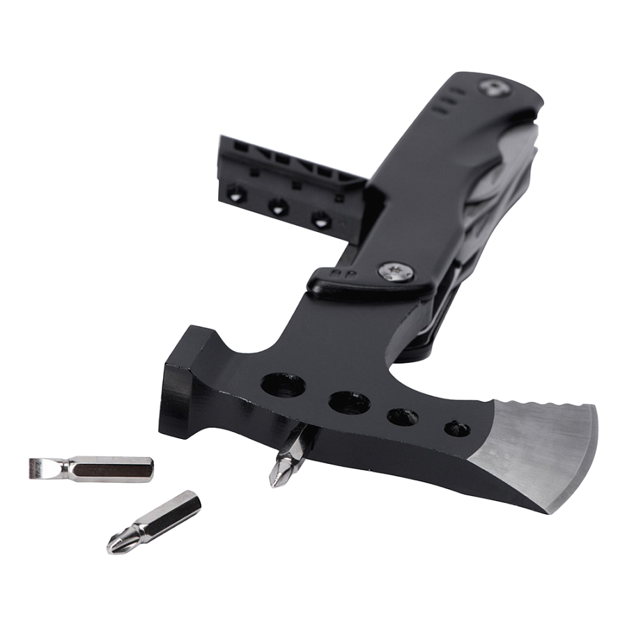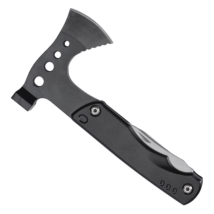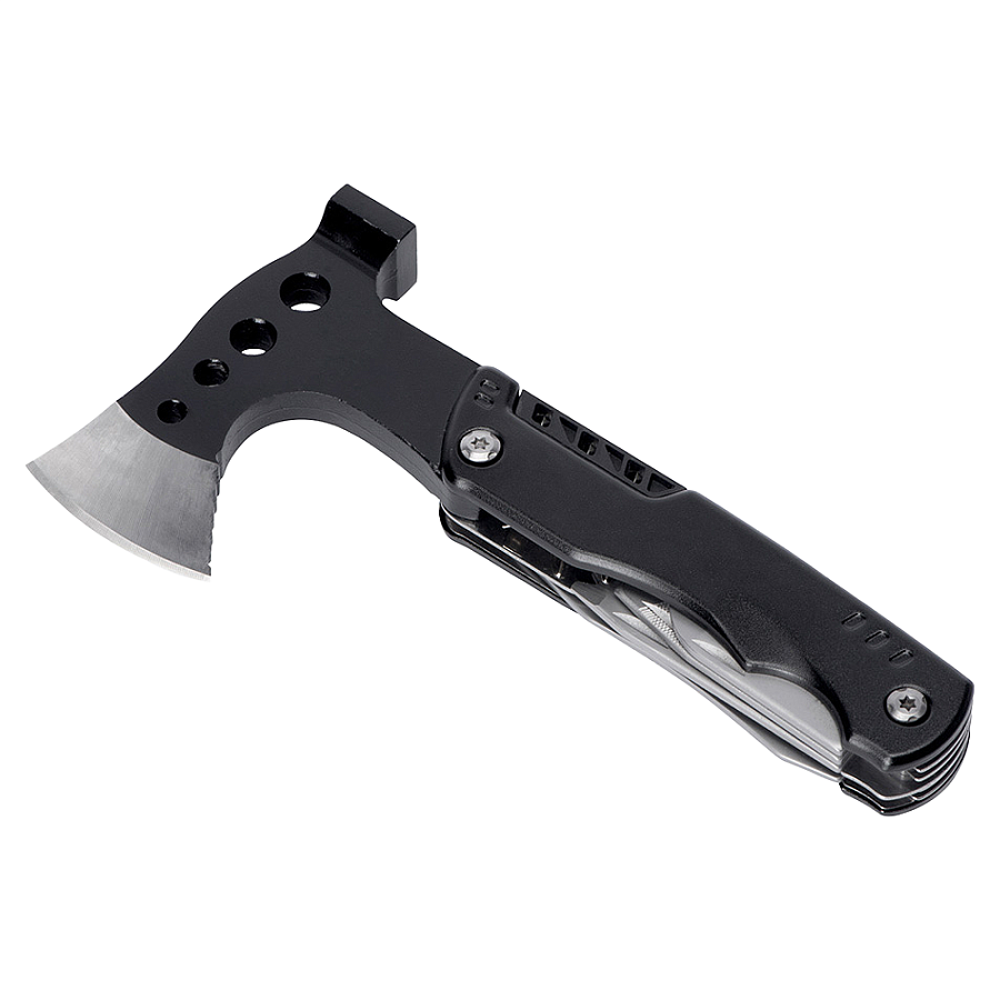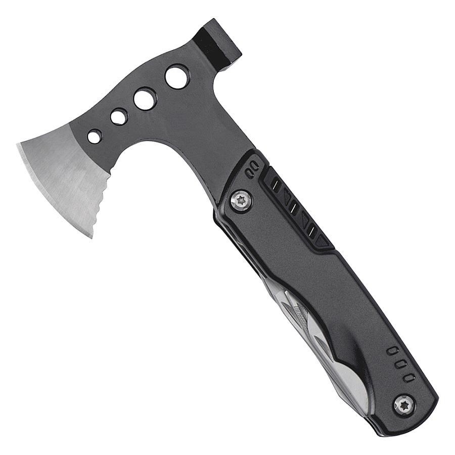Практичный и надежный инструмент для активного отдыха, дачи или в качестве подарка. Изготовлен из нержавеющей стали марки 420, мультитул обладает весом 404 г — это обеспечивает удобство при использовании топора и молотка, добавляя уверенность в каждом движении.
