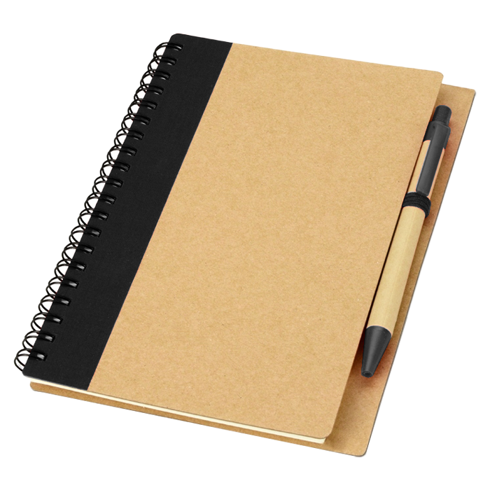 Спиральный блокнот в твёрдой крафтовой обложке с вертикальной тканевой вставкой. Оснащён ручкой в тон, закреплённой на боковой петле — всегда под рукой для быстрых заметок.