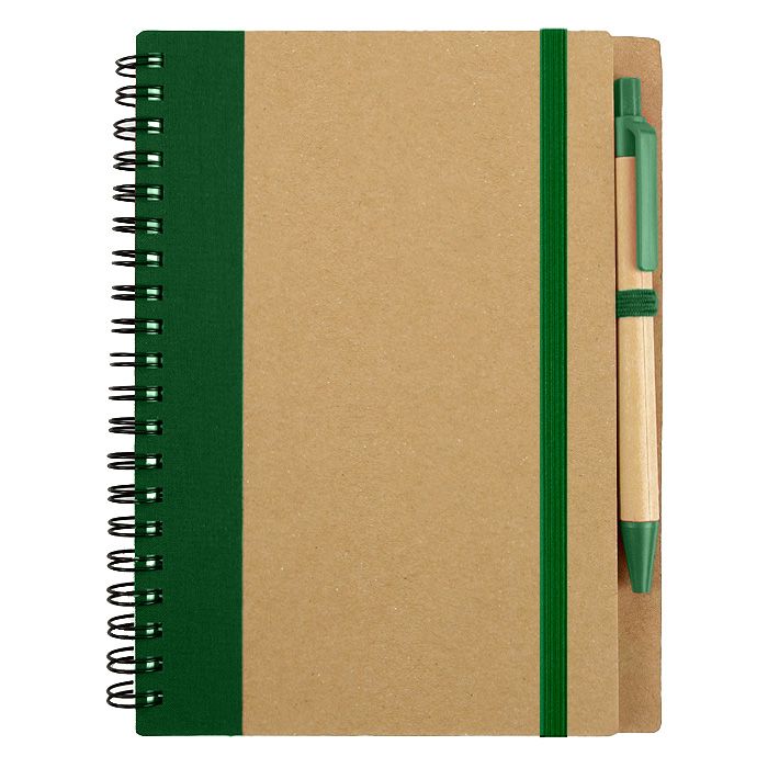 Спиральный блокнот в твёрдой крафтовой обложке с вертикальной тканевой вставкой. Оснащён ручкой в тон, закреплённой на боковой петле — всегда под рукой для быстрых заметок.