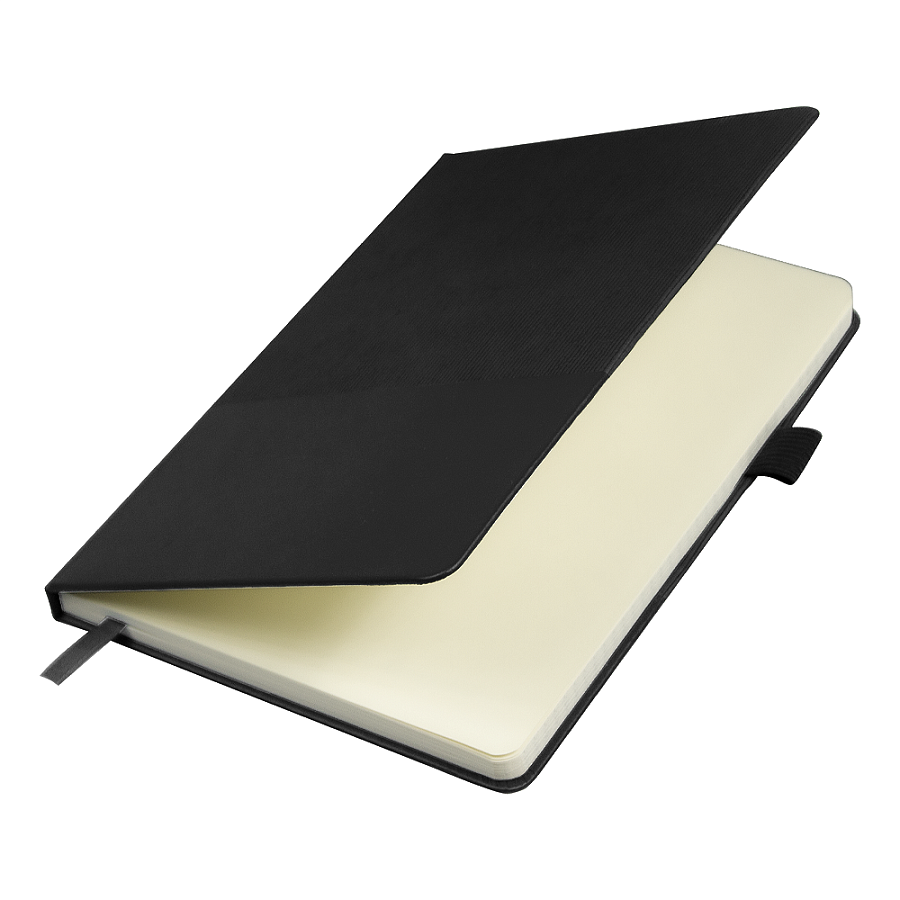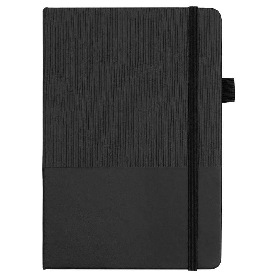 Стильный блокнот в твёрдой обложке с текстурированной верхней частью и гладким нижним сегментом. Оснащён вертикальной резинкой для фиксации и петлёй для ручки — всё под рукой.