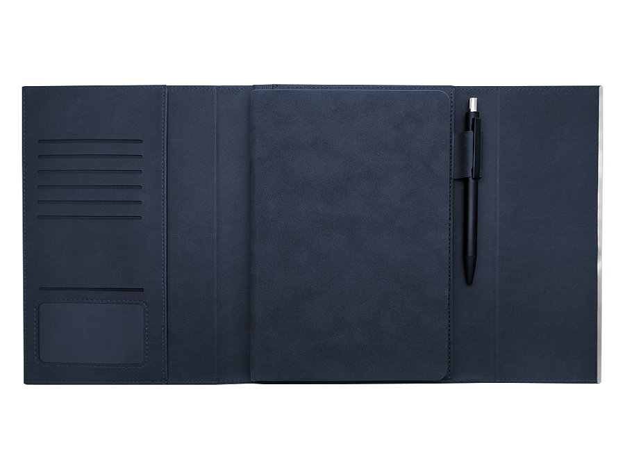 В комплекте гибкий недатированный ежедневник в обложке Nuba, имеющий прокрашенный срез и металлический шильд. По желанию заказчика ежедневник-портфолио может комплектоваться любым недатированным ежедневником из нашего ассортимента.