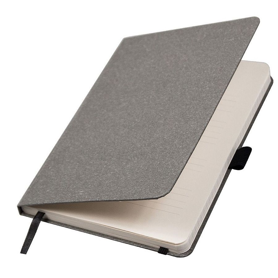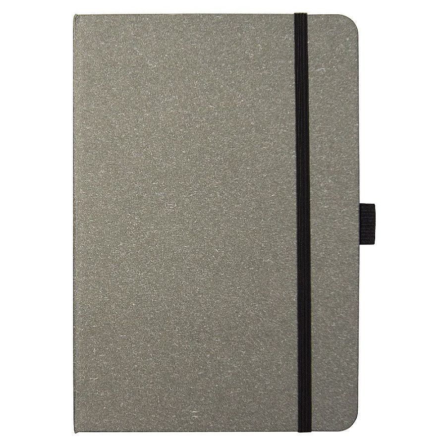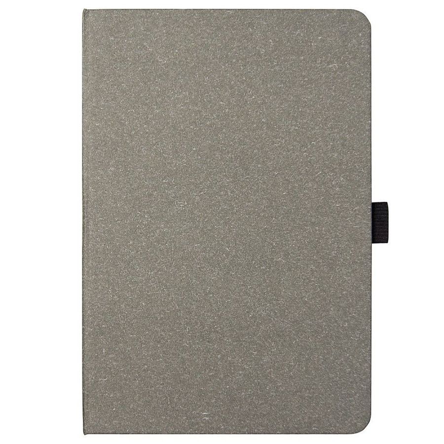 Твердая обложка выполнена из переработанной бумаги с характерной фактурой: матовая, слегка шероховатая поверхность с едва заметными вкраплениями волокон создает ощущение натуральности и тепла, напоминая ручную бумагу премиум-класса. Такой материал не только подчеркивает заботу об окружающей среде, но и придает блокноту уникальный винтажный шарм.