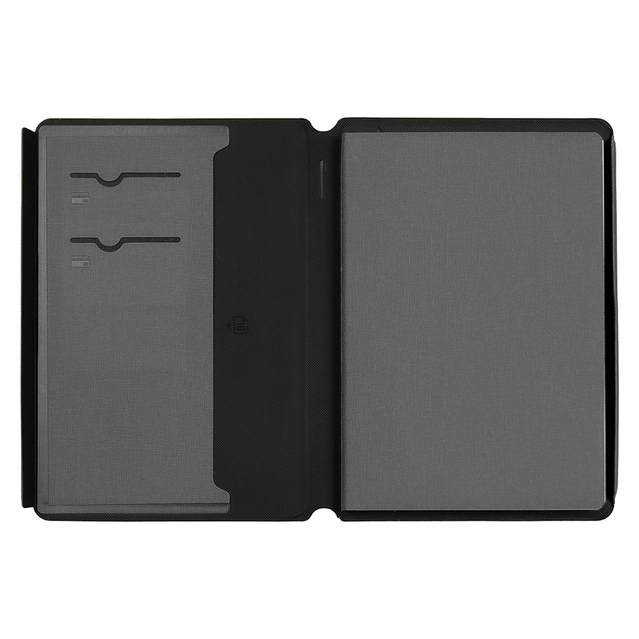 Суперобложка оснащена интегрированными карманами для карт и заметок.