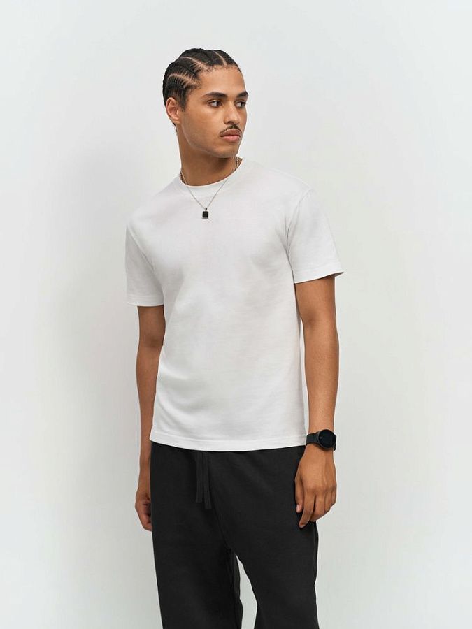 Ткань хорошо держит форму и не просвечивает, при этом футболка остается мягкой и приятной к телу. Особенности обработки волокна и конструкция с заметной высокой горловиной создает аутентичный образ с винтажной фактурой.