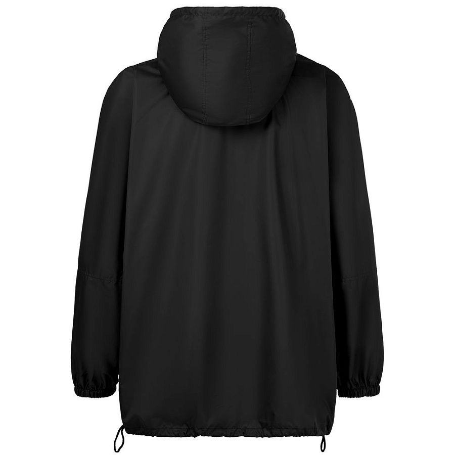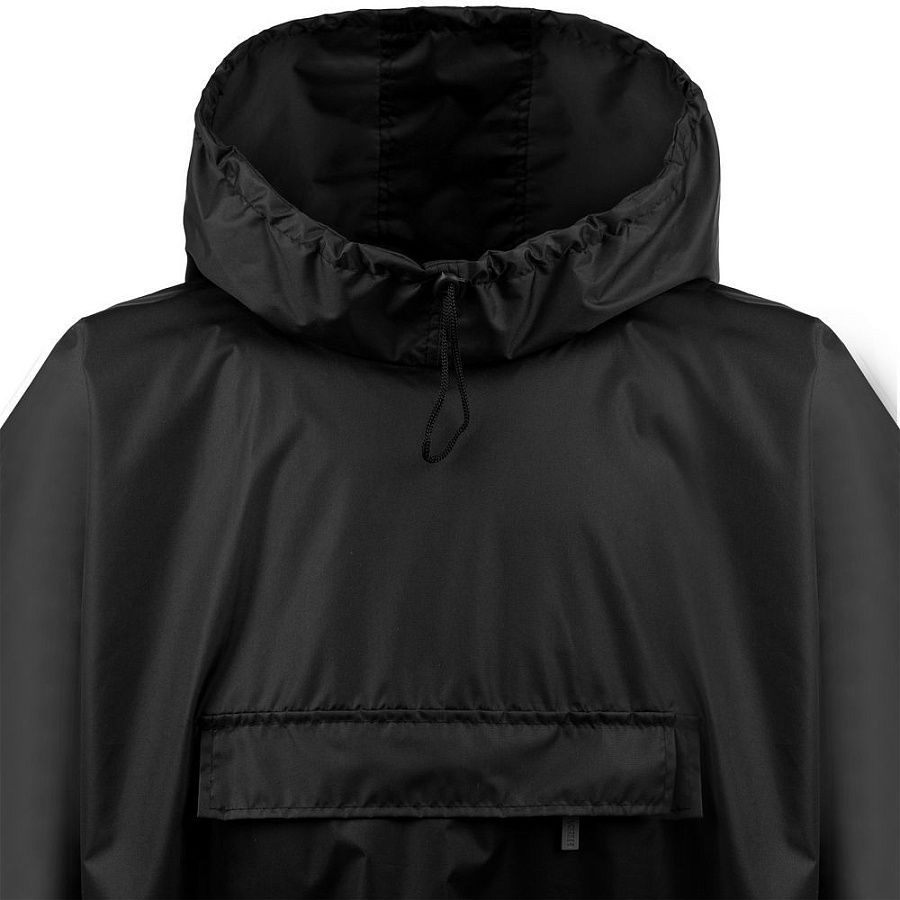 Дождевик-анорак с капюшоном и карманом на молнии спереди. Выполнен из ткани дюспо с матовой поверхностью — легкой, мягкой на ощупь, но устойчивой к повреждениям. Она не шелестит и практически не мнется. Благодаря пропитке дюспо обладает отличными водоотталкивающими и ветрозащитными свойствами.