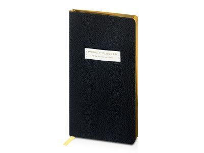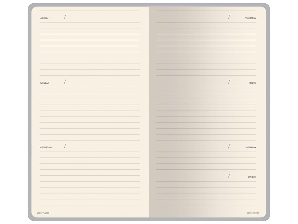 Внутри — недатированный блок формата А6 (84×160 мм) на бежевой бумаге 80 г/м². Книжный переплёт хорошо раскрывается, а скруглённые углы одновременно придают еженедельнику премиальный вид и защищают края при носке. Ляссе‑закладка выполнена в цвет обложки и помогает быстро находить нужную страницу.