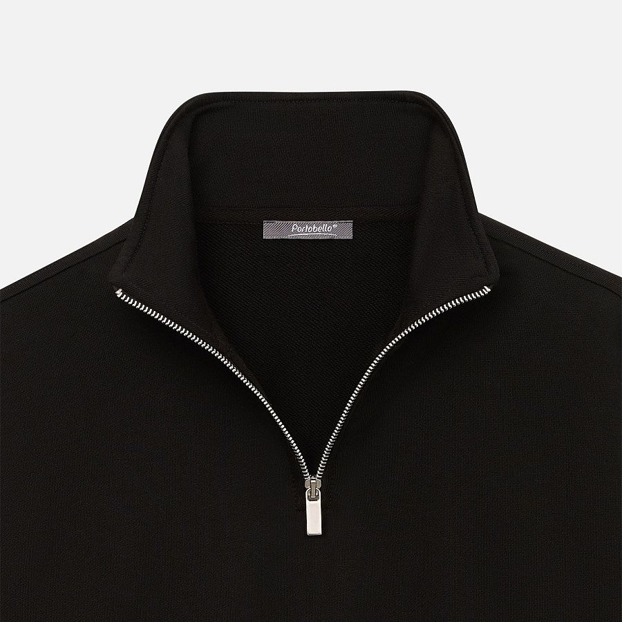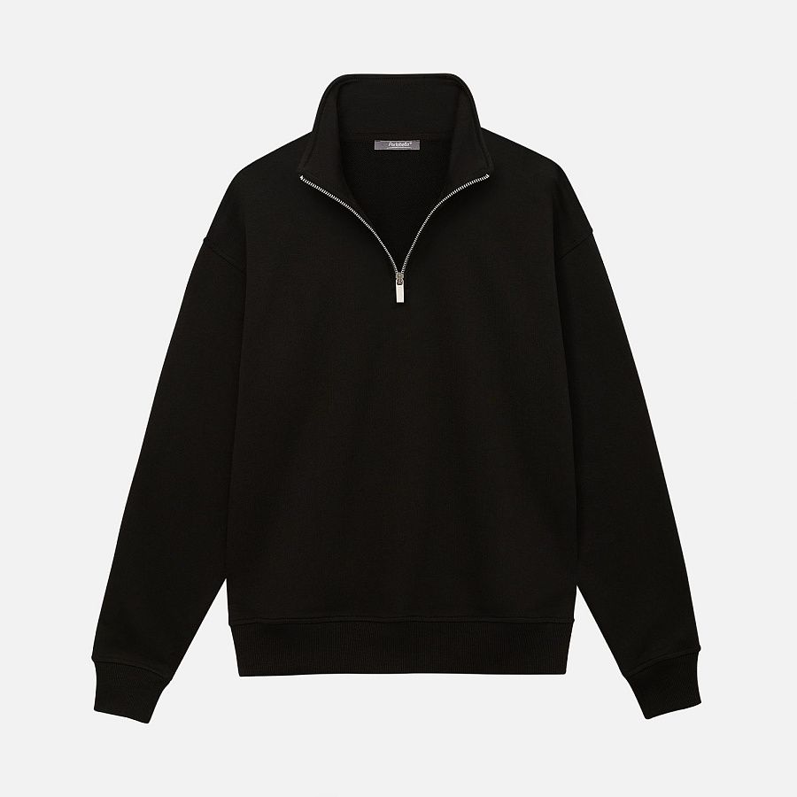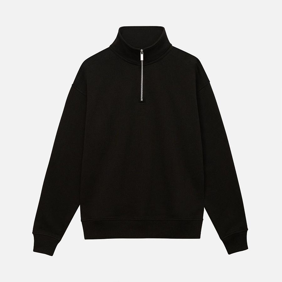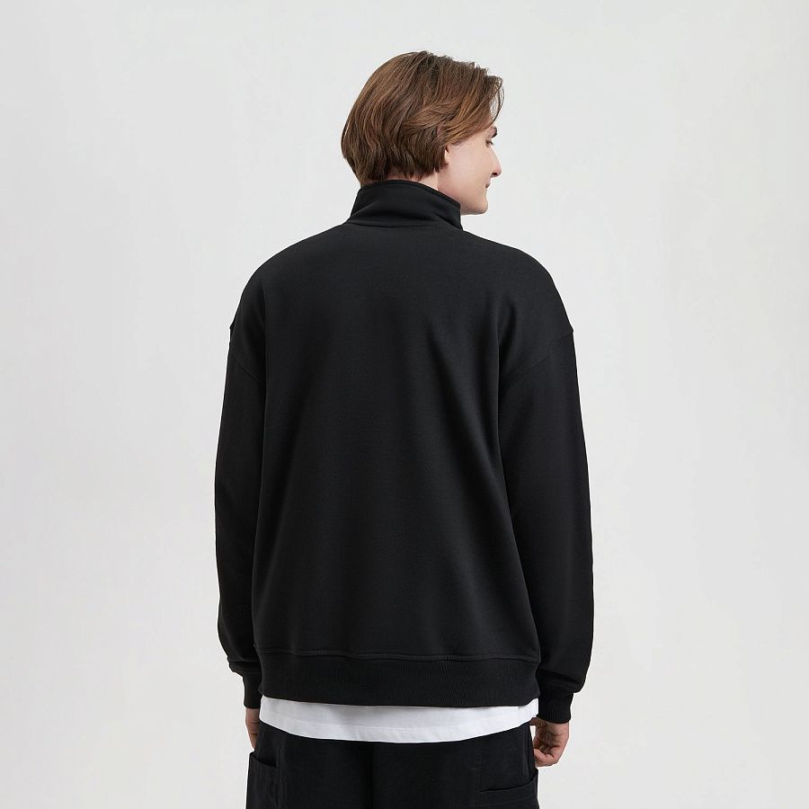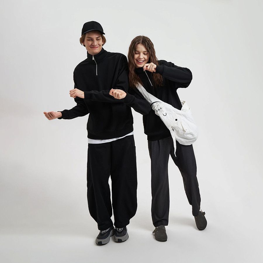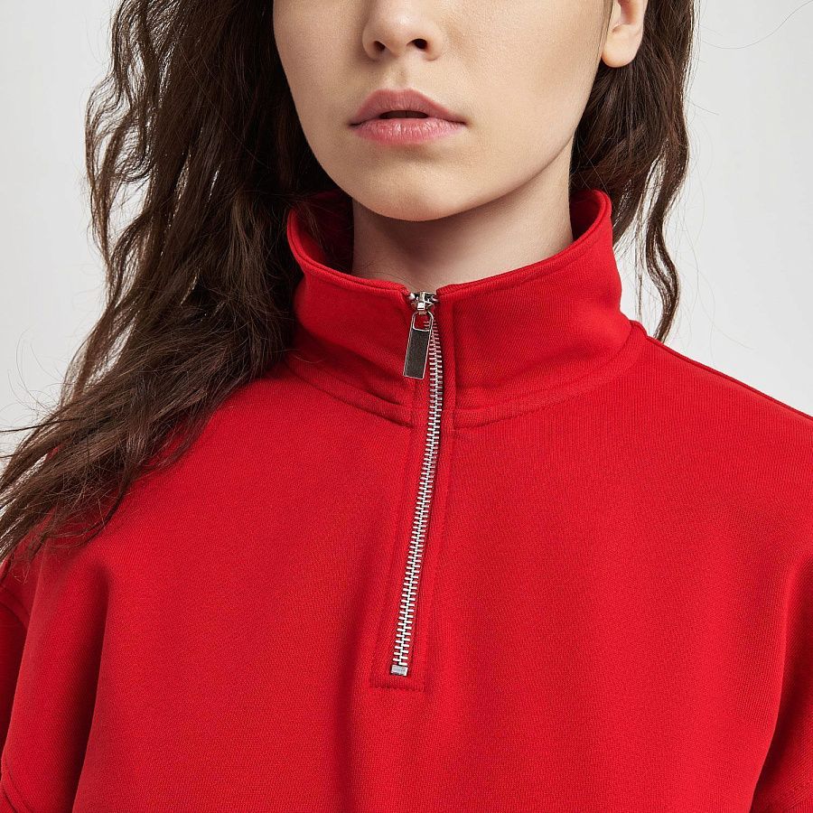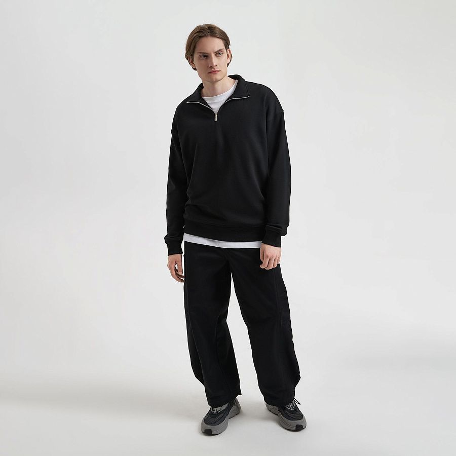 Универсальная толстовка с воротником-стойкой и заниженной линией плеча. По нижнему краю и на рукавах — эластичные резинки для комфортной и аккуратной посадки. Модель застёгивается на металлическую молнию.