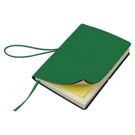 Гибкая обложка с текстурой ткани, горизонтальная резинка-фиксатор и закладка-лента. Внутри — страницы в линейку и набор цветных стикеров для заметок, маркировки и планирования.