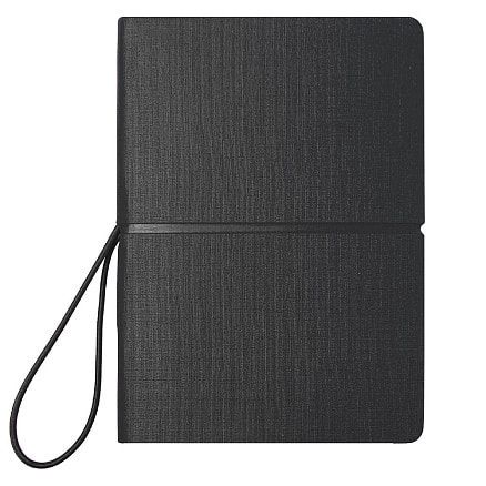 Гибкая обложка с текстурой ткани, горизонтальная резинка-фиксатор и закладка-лента. Внутри — страницы в линейку и набор цветных стикеров для заметок, маркировки и планирования.