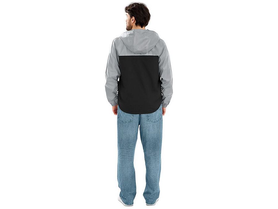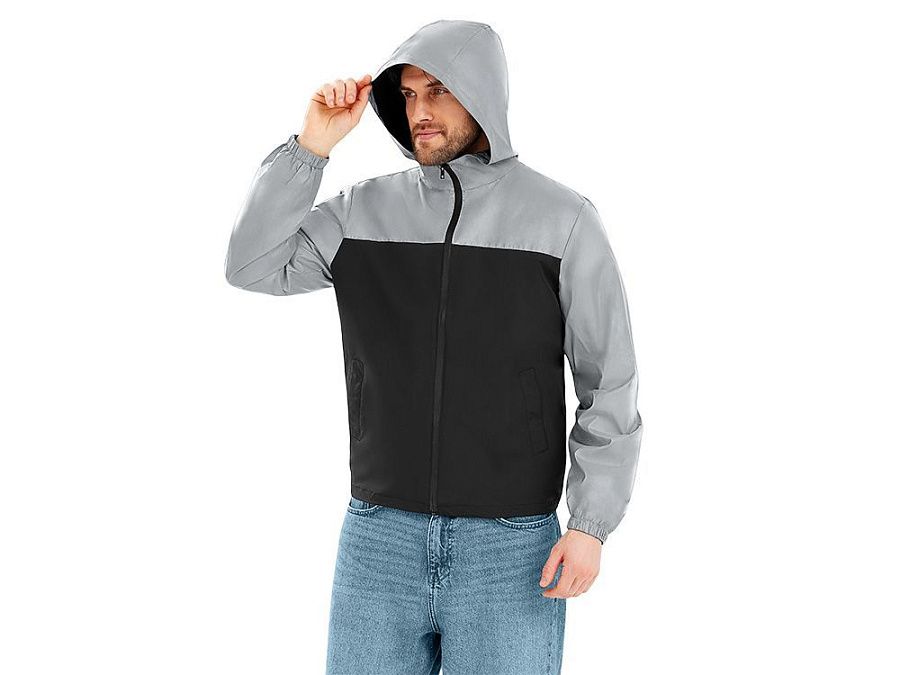 Streetwear-ветровка с контрастным дизайном: верх переда и спинки, рукава и капюшон — из светоотражающей ткани, низ — из прочной чёрной полиэстеровой ткани. Модель на подкладке, со спинкой длиннее переда.