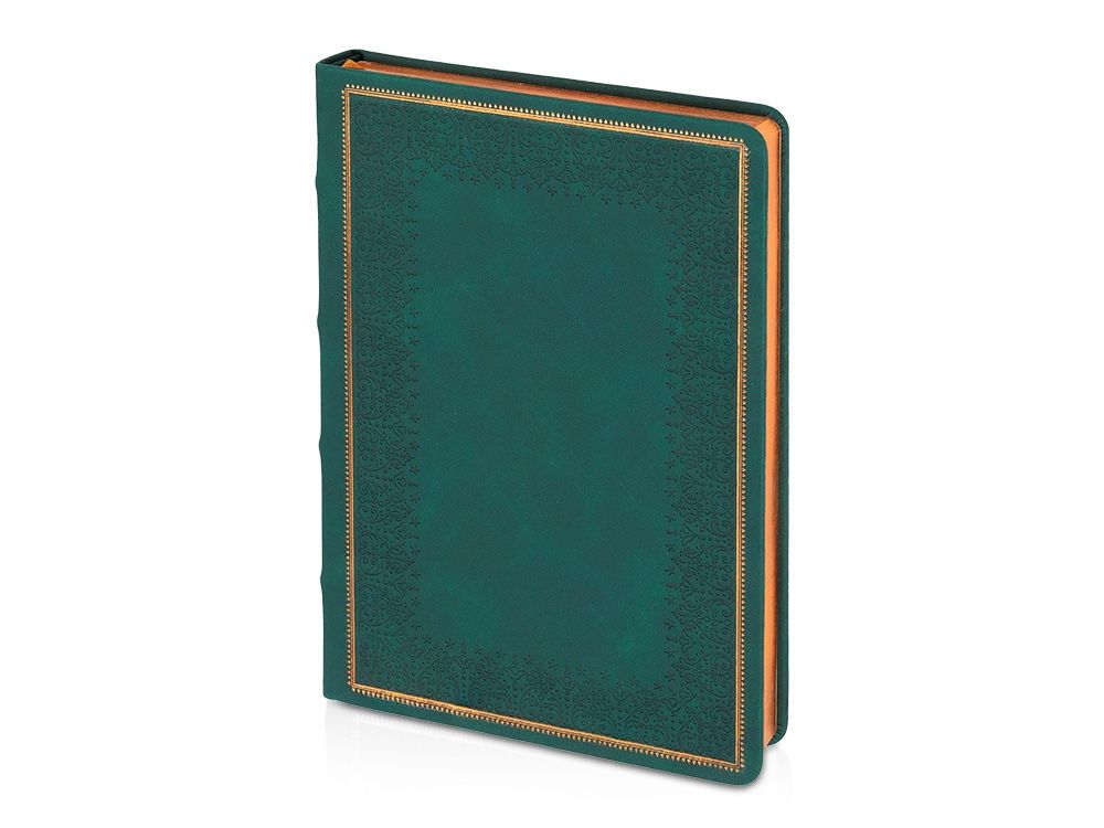 Недатированный ежедневник "Royal" формата А5 с твердой обложкой из искусственной кожи с имитацией нубука украшен художественным бронзовым и блинтовым тиснением. Внутри 256 страниц, выполненных из качественной бежевой бумаги в линейку плотностью 100 г/м². Два шелковых ляссе в цвет обреза блока и обложки облегчают навигацию по записям. Французский корешок дополнительно декорирован изящным бронзовым тиснением в виде виньеток. Скругленные углы обложки и блока подчеркивают стильный дизайн изделия, а блеск бронзового обреза дарит ежедневнику благородный и роскошный внешний вид.