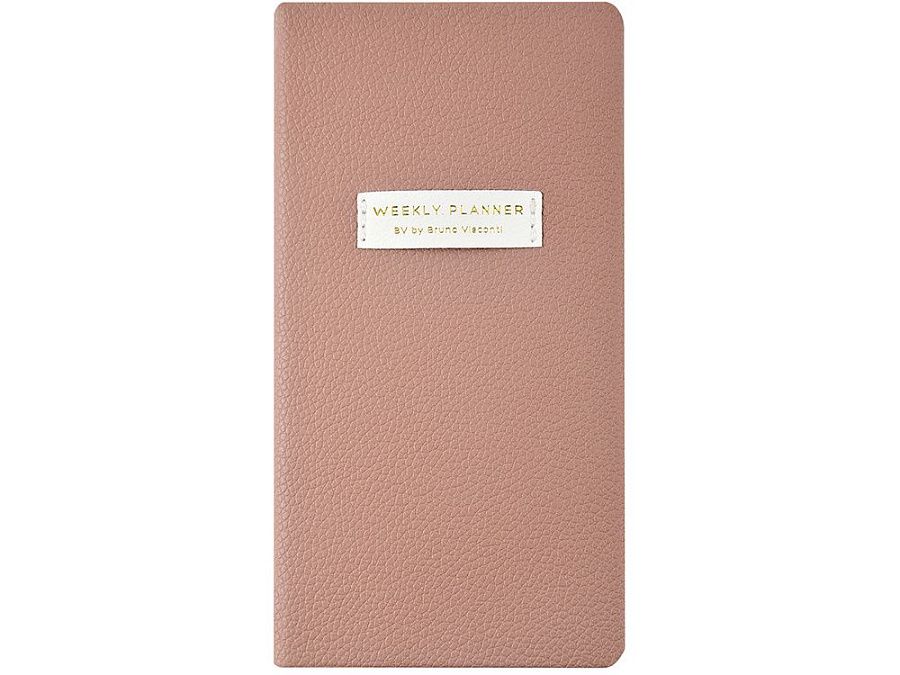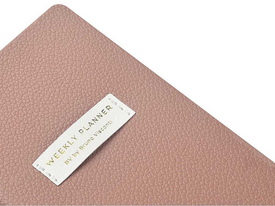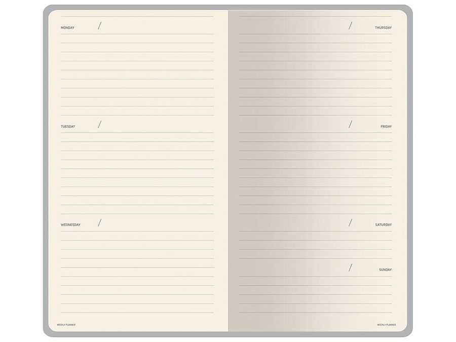 Внутри — недатированный блок формата А6 (84×160 мм) на бежевой бумаге 80 г/м². Книжный переплёт хорошо раскрывается, а скруглённые углы одновременно придают еженедельнику премиальный вид и защищают края при носке. Ляссе‑закладка выполнена в цвет обложки и помогает быстро находить нужную страницу.