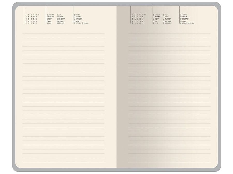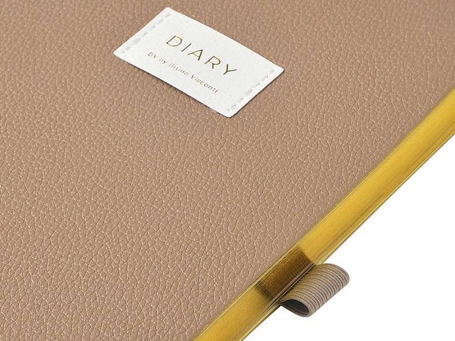 Внутри — недатированный блок формата А5 (125×200 мм) на бежевой бумаге 80 г/м². Книжный переплёт хорошо раскрывается, а скруглённые углы одновременно придают ежедневнику премиальный вид и защищают края при носке. Завершают детали ляссе в цвет обложки и петля для ручки — чтобы всё нужное было под рукой.