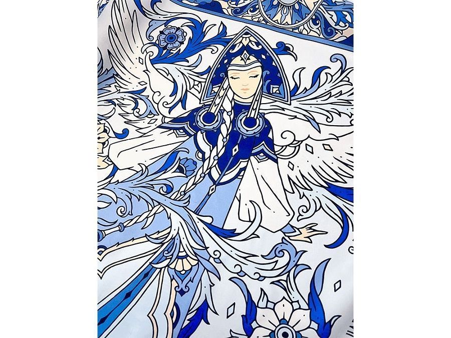 В центре авторского принта — удивительной красоты женщина с белоснежными крыльями, наделенная магическими способностями и житейской мудростью. Оригинальное сочетание тонов, цветочных орнаментов и русского колорита делают аксессуар нежным и самобытным.