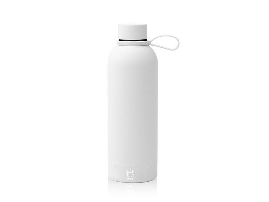 Термобутылка из переработанной нержавеющей стали 304. Мягкая прорезиненная поверхность на корпусе. Удобная силиконовая ручка для переноски. Оснащена противокапельной системой благодаря силиконовому кольцу, встроенному во внутреннюю часть крышки. Крышка и ручка соответствуют цвету корпуса. Объем: 500 мл.