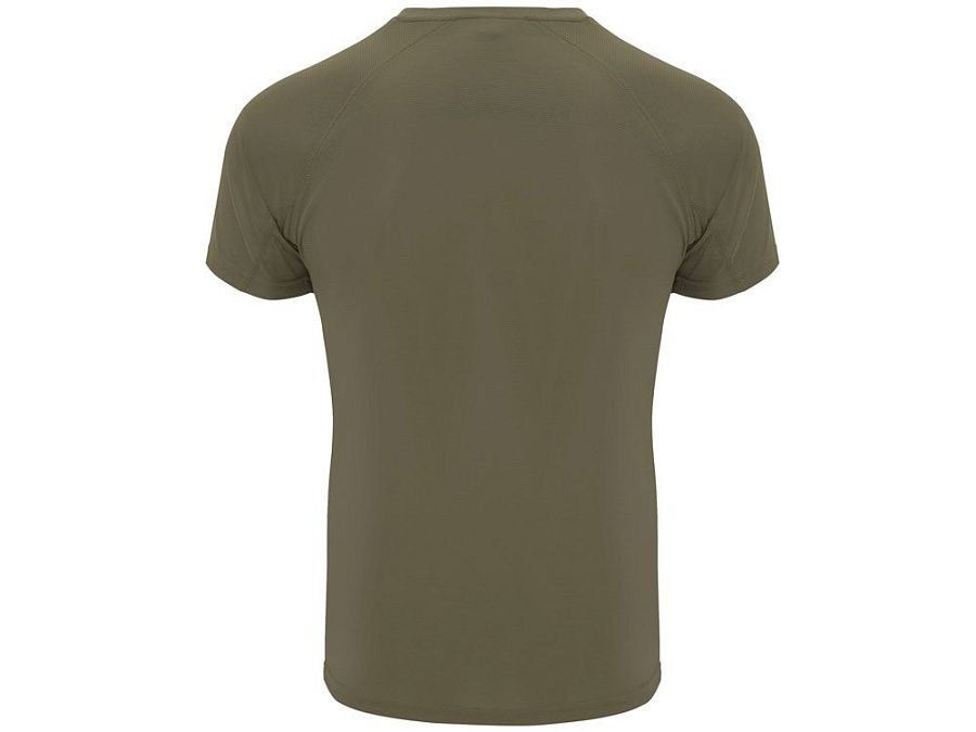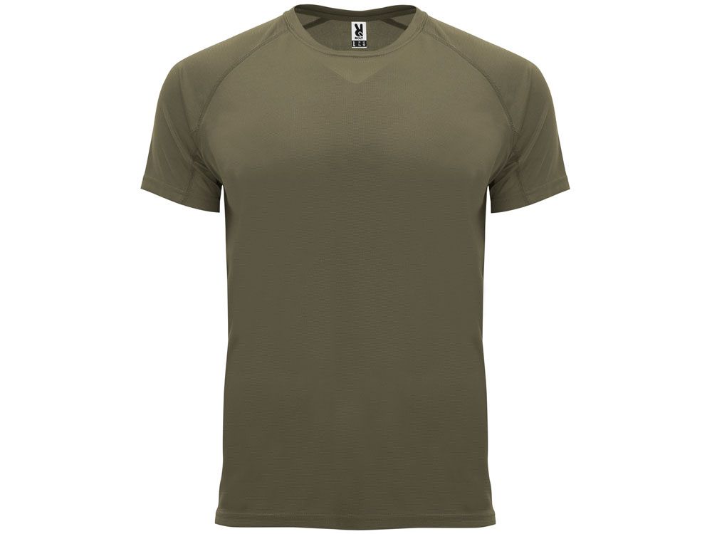 Спортивная футболка с коротким рукавом реглан. Круглый вырез горловины с отделкой плоским швом. Рукав сложного кроя для обеспечения дополнительного удобства при занятиях спортом. Отделка плоским швом с застилом по пройме и рукавам.