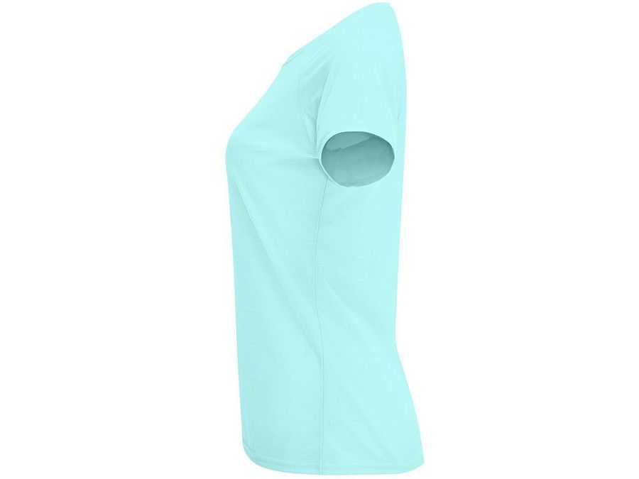 Спортивная футболка с коротким рукавом реглан для женщин. Круглый вырез горловины с отделкой плоским швом. Рукав сложного кроя для обеспечения дополнительного удобства при занятиях спортом. Отделка плоским швом с застилом по пройме и рукавам.