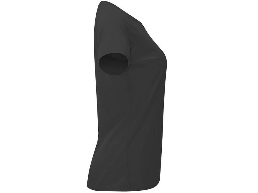 Спортивная футболка с коротким рукавом реглан для женщин. Круглый вырез горловины с отделкой плоским швом. Рукав сложного кроя для обеспечения дополнительного удобства при занятиях спортом. Отделка плоским швом с застилом по пройме и рукавам.